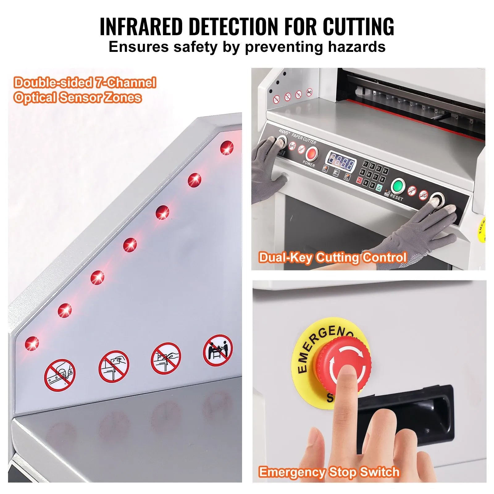 - Infrared Light Positioning: Enclosed infrared light baffles are designed on both sides of the paper cutter guillotine. The positioning of infrared light makes the paper cutting more intuitive and accurate and provides more secure and reliable operation.