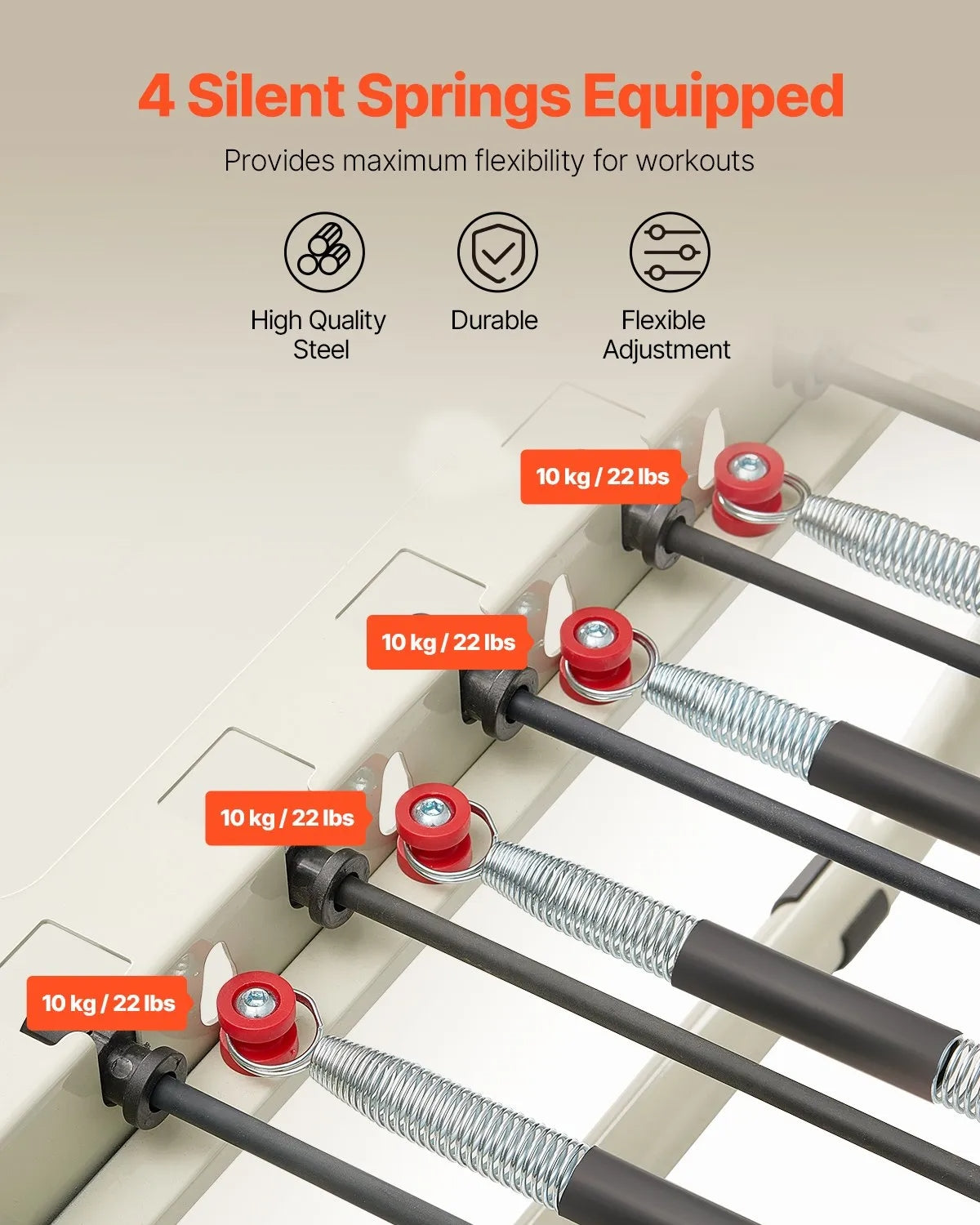 - Premium Springs: Crafted with high-quality steel spring, this home workout pilates equipment offers 4 levels of spring resistance to engage your upper body, lower body, and core muscles. This set features 4 equally tensioned light springs, perfect for advanced users.