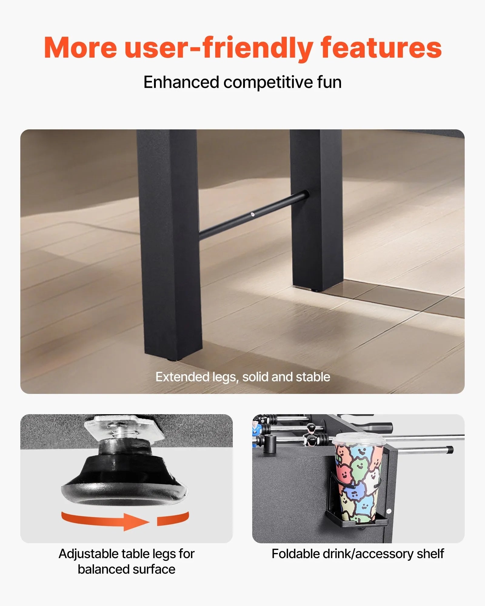 - Smooth Ball Movement: The foosball table's comfortable height is suitable for most people. Extended legs ensure the stability of the table, and you can adjust these legs to maintain a balanced playing surface for more accurate ball control