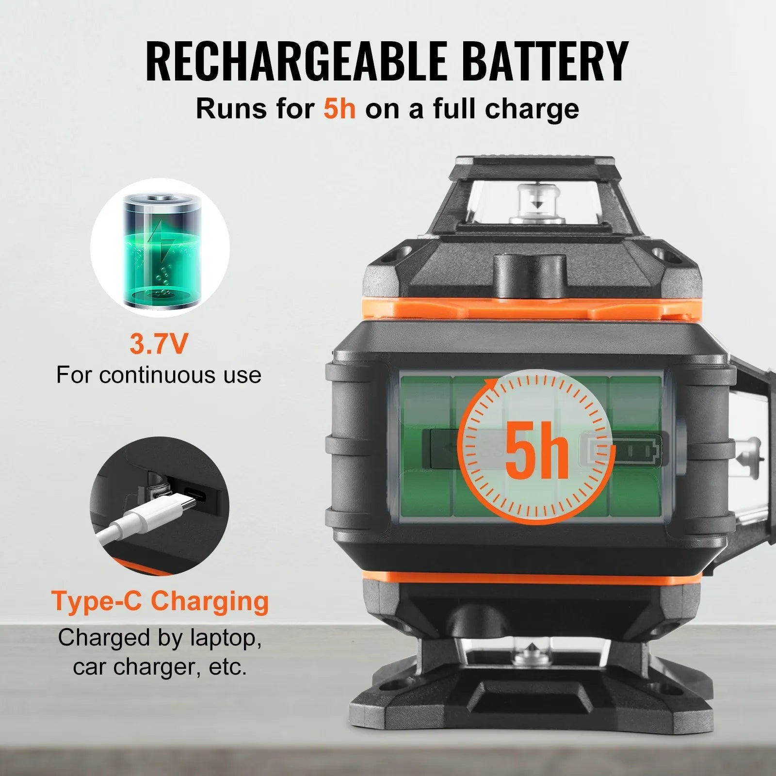 - Fast Charging: Our laser level features a rechargeable 3.7V battery which offers an estimated 8 hours of operation. The laser tool is also equipped with a Type-C charging port for continued use on the job site when the battery dies. For a speedy charge, it can be effortlessly connected to a laptop, mobile power supply, or wall adapter.