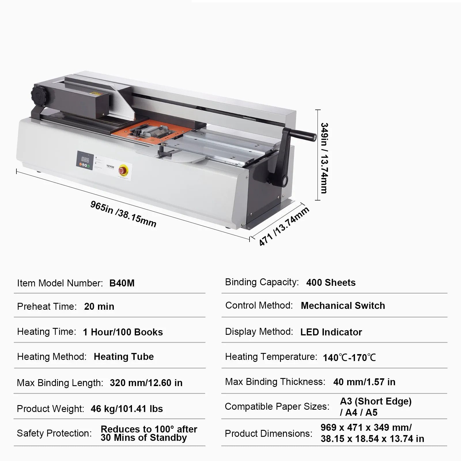 - Large Binding Capacity: Compatible with A3 (short edge), A4, and A5 paper, this thermal book binder can bind up to 400 sheets with a thickness of up to 40mm at once. Make your document organization more efficient and convenient!