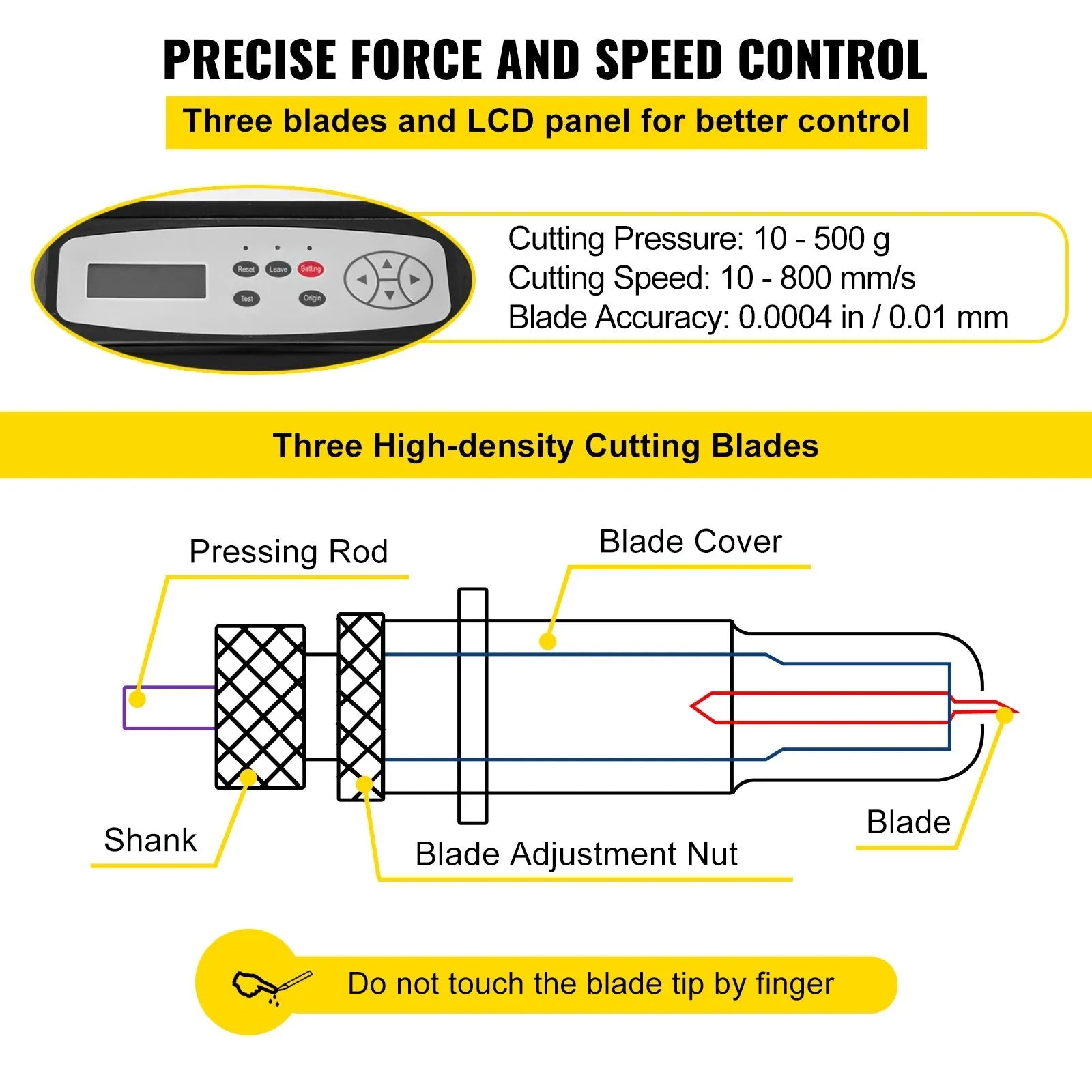 - High-precision Operation: The LCD panel facilitates the adjustment of pressure and speed with a clear readout and buttons. Adjustable Cutting Pressure: 10 - 500 g; Cutting Speed: 10 - 800 mm/s; Blade Accuracy: 0.0004 in / 0.01 mm.